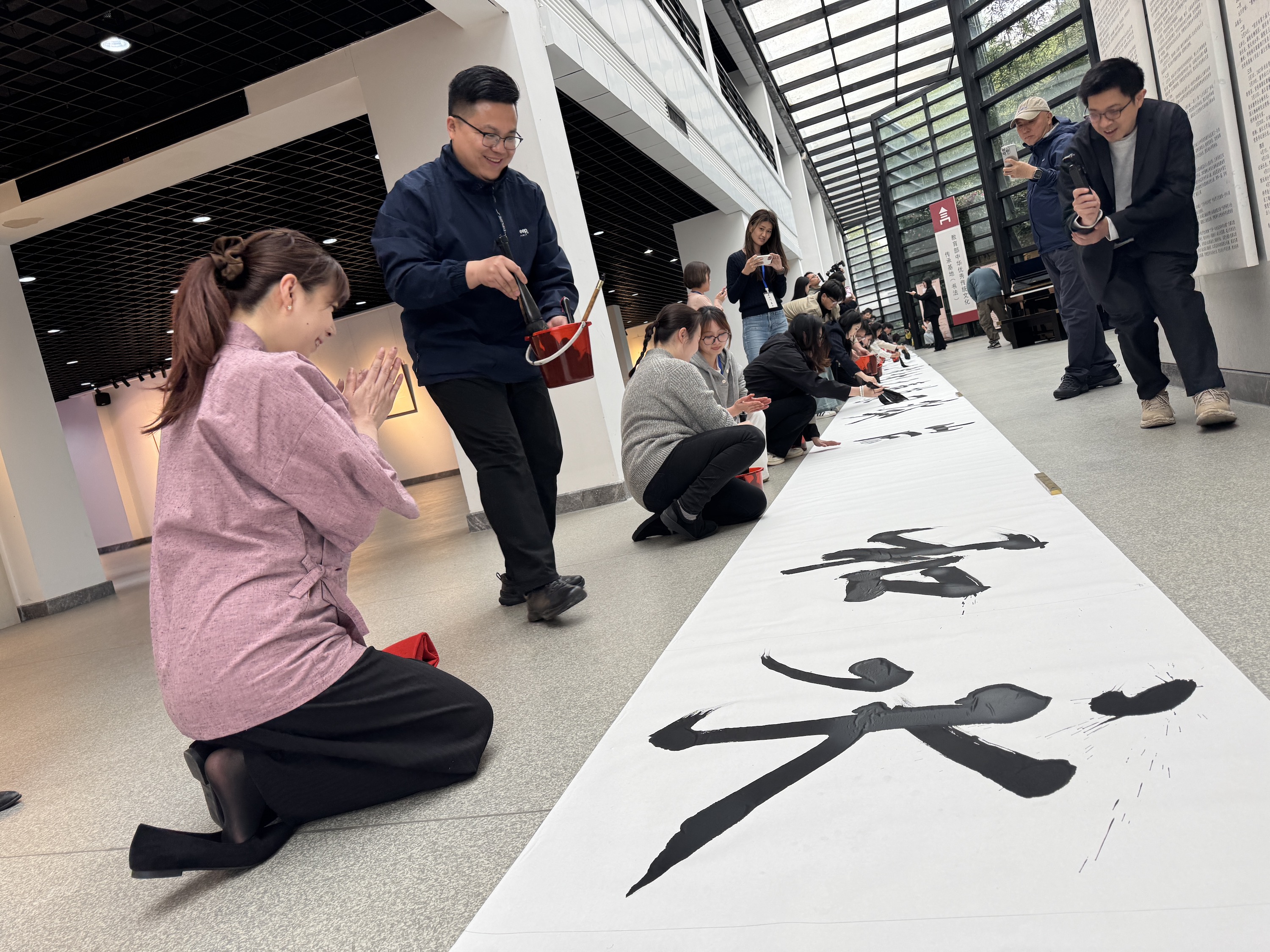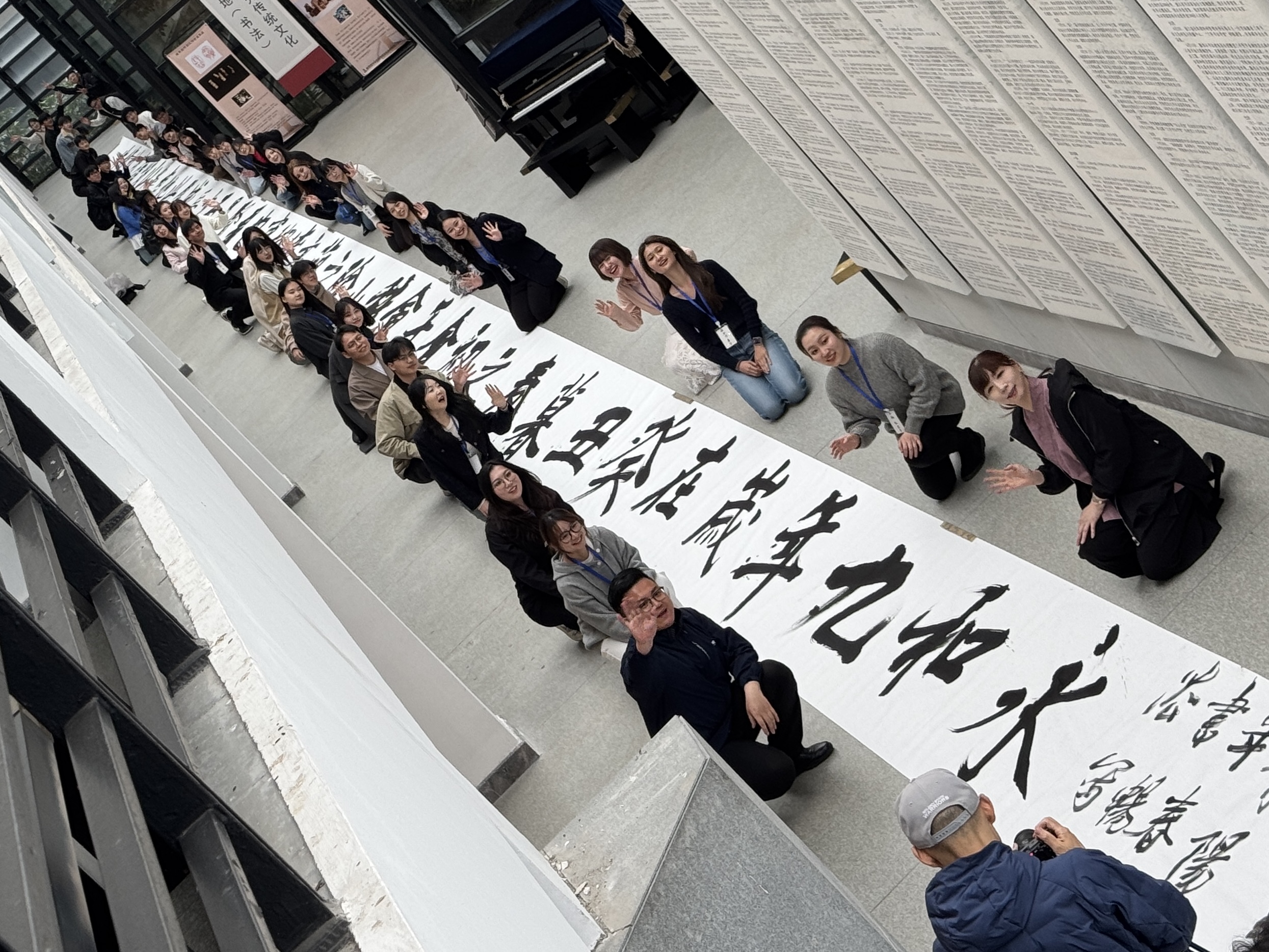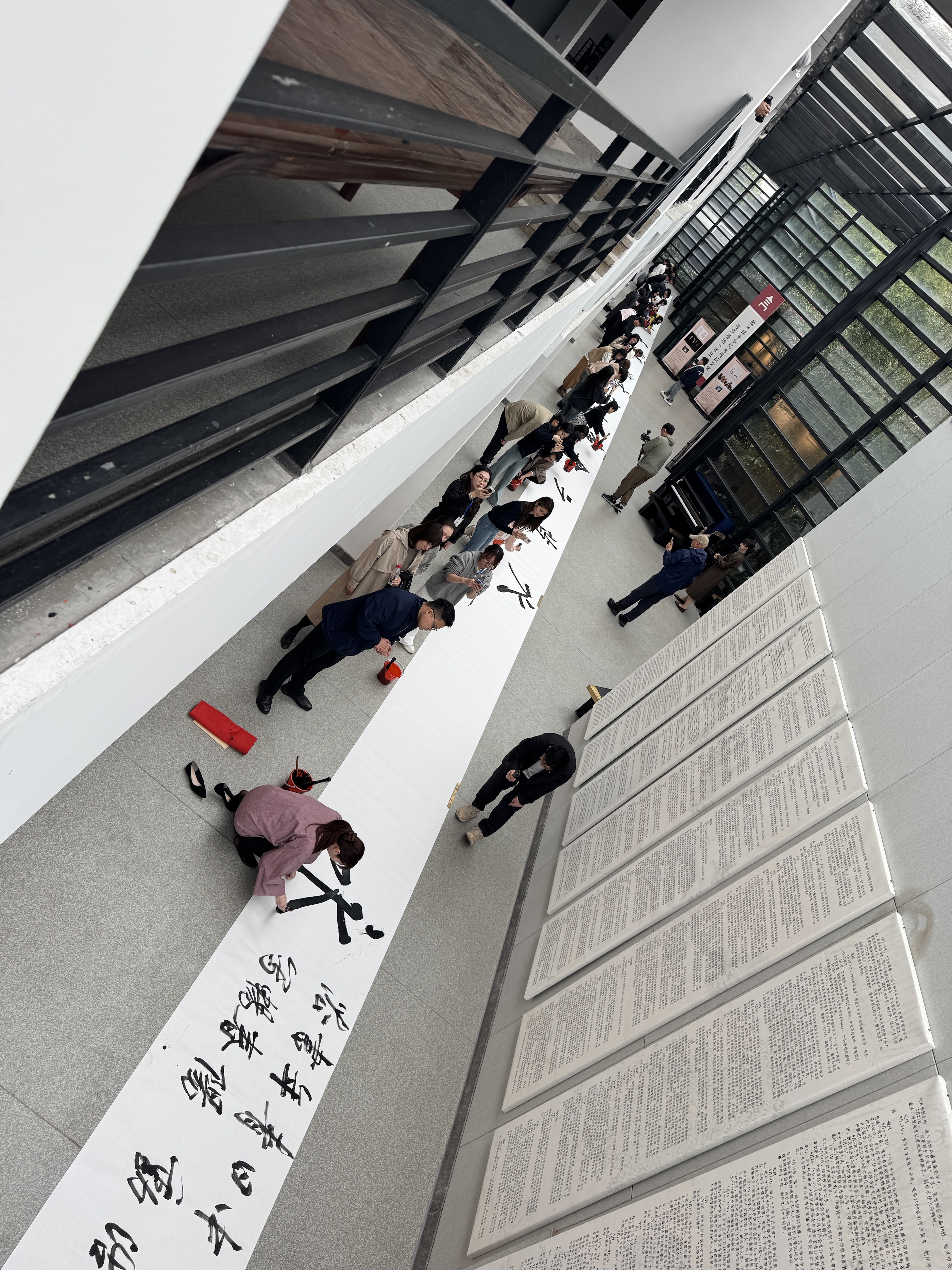 陽春暢写は蘭亭書道芸術学院の春の恒例行事。大きな紙に大きな字を、一人一字ずつのびのびと書きます。今回は学内展示ホールの通路を目いっぱい使って、長さ44メートルの紙に44文字を書き上げました。題材は「蘭亭序」。貴重な体験になりました。