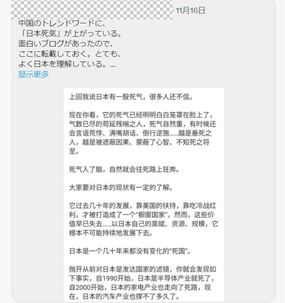 先日、Xを眺めていた際、ある投稿に目が留まり、思わずスクロールを止めた。それは、日本のユーザーが、中国のブログに掲載された「日本には『死気』が漂っている」という長文を日本語に訳して紹介したものだった。刺激的な表題からすれば、日本人の反発が起きてもおかしくないように思えたが、コメント欄には意外にも、「ぐうの音も出ない」「厳しい意見だが反論はない」「概ね肯定で苦笑しかない」といった声が多く並んでいた。