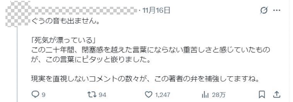 ▲多くのユーザーが「日本に死気」投稿に共感のコメントを寄せた