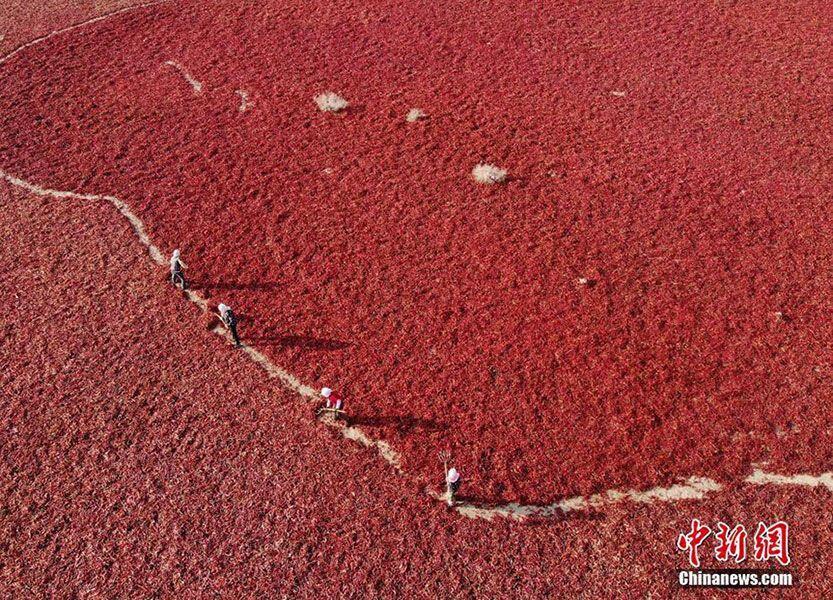 10月中旬,祁连山下的甘肃高台县合黎镇800亩辣椒晒场如“红色海洋”,蔚为壮观。高台县已有上百年的辣椒种植历史,“高台辣椒干”已被列入中国农产品地理标志保护行列。高台辣椒种植面积达13000多亩,年总产辣椒26300多吨,辣椒种植和加工已成为当地农民致富增收的特色产业。