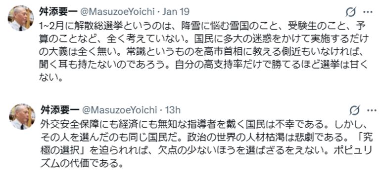 前東京都知事の舛添要一氏は19日に自身のXで、今回の解散は「国民に多大の迷惑をかけてまで実施するだけの大義は全くない」と投稿し、さらに23日にも「外交安全保障にも経済にも無知な指導者を頂く国民は不幸である」「ポピュリズムの代価」と配信しました。