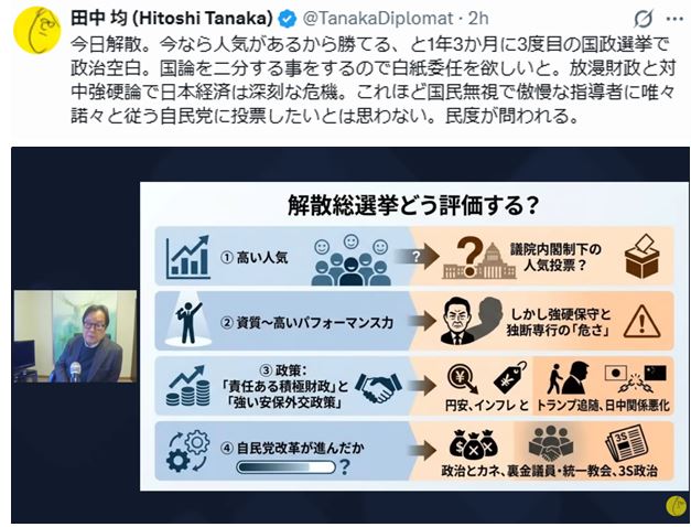 外務審議官などを歴任した田中均氏が23日にXで、「1年3カ月で3度目の国政選挙で政治空白。国論を二分する事をやるので白紙委任が欲しいと。放漫財政と対中強硬論で日本経済は深刻な危機」と投稿。田中氏はこれに先立ち、22日のYouTubeチャンネルの「田中均の国際政治塾」で、今回の解散は選挙のための「人気投票」とし、「高いパフォーマンス力だけが資質ではない」、「本家本元の自民党改革が進んだかどうかを見て判断すべき」と選挙民に呼びかけています。また、高市政策の継続は日本に繁栄をもたらすどころか、インフレの加速、円安の悪化、トランプ追随のエスカレートにより、国際社会での日本の地位低下を招きかねないと「怒りに満ちた」切り込みを行いました。さらに、高市首相が存立危機事態発言を撤回しない理由は「日本国内の反中世論に乗っかる形で、中国に対して強硬な姿勢を取るのが国内の人気を高めるのに役に立つと考えるからだ」とそのポピュリズム的な政治手法を批判しました。