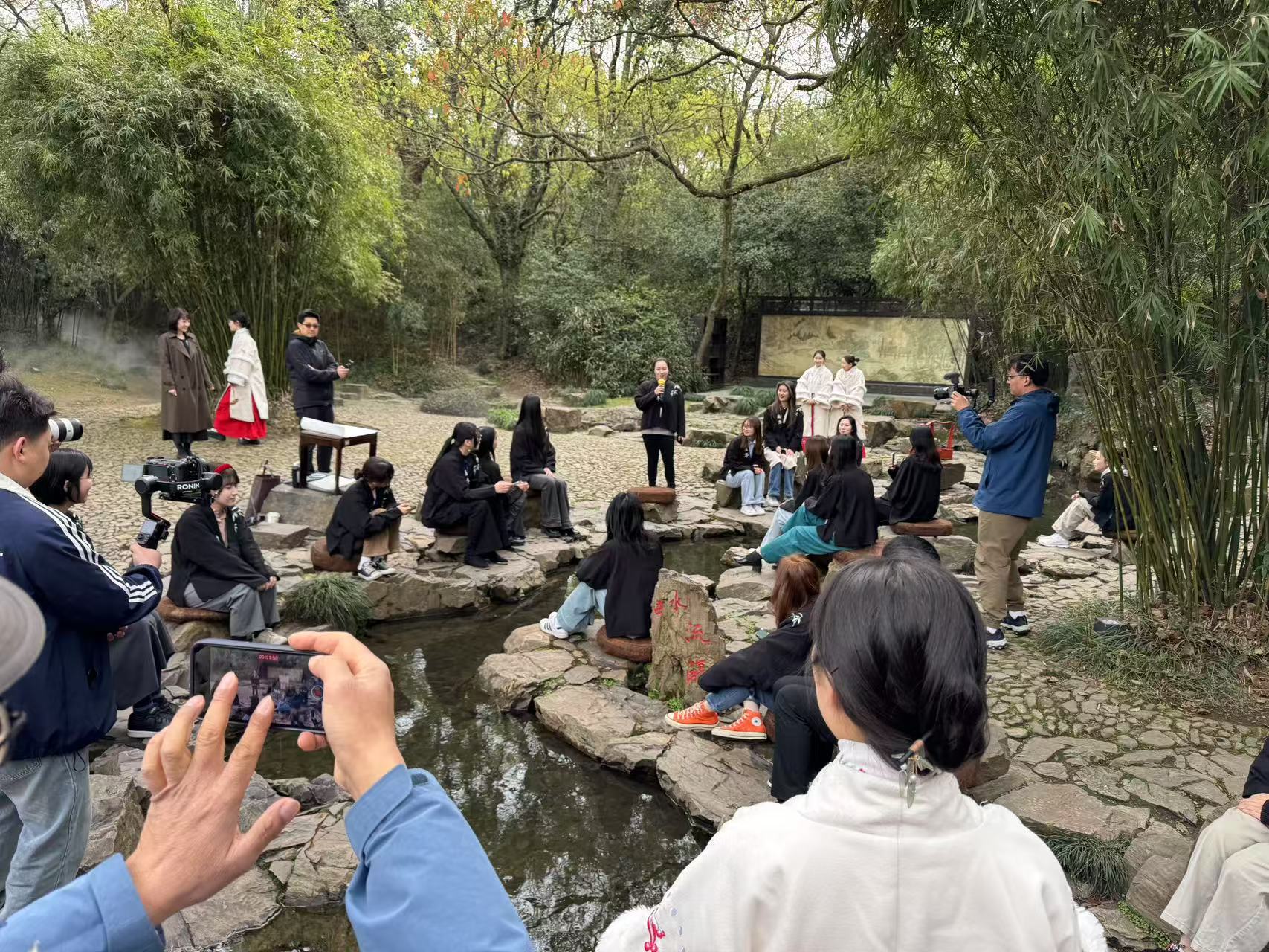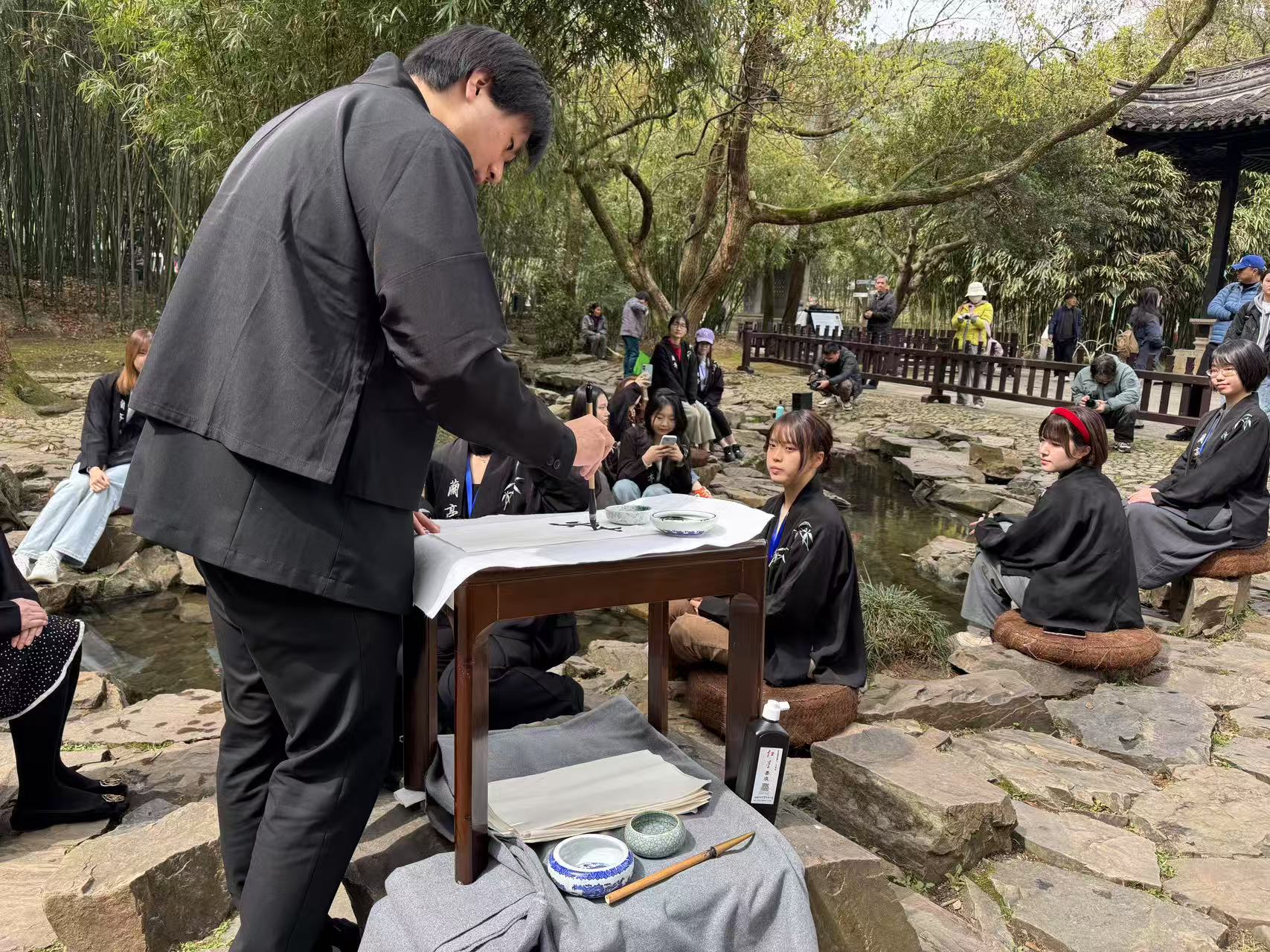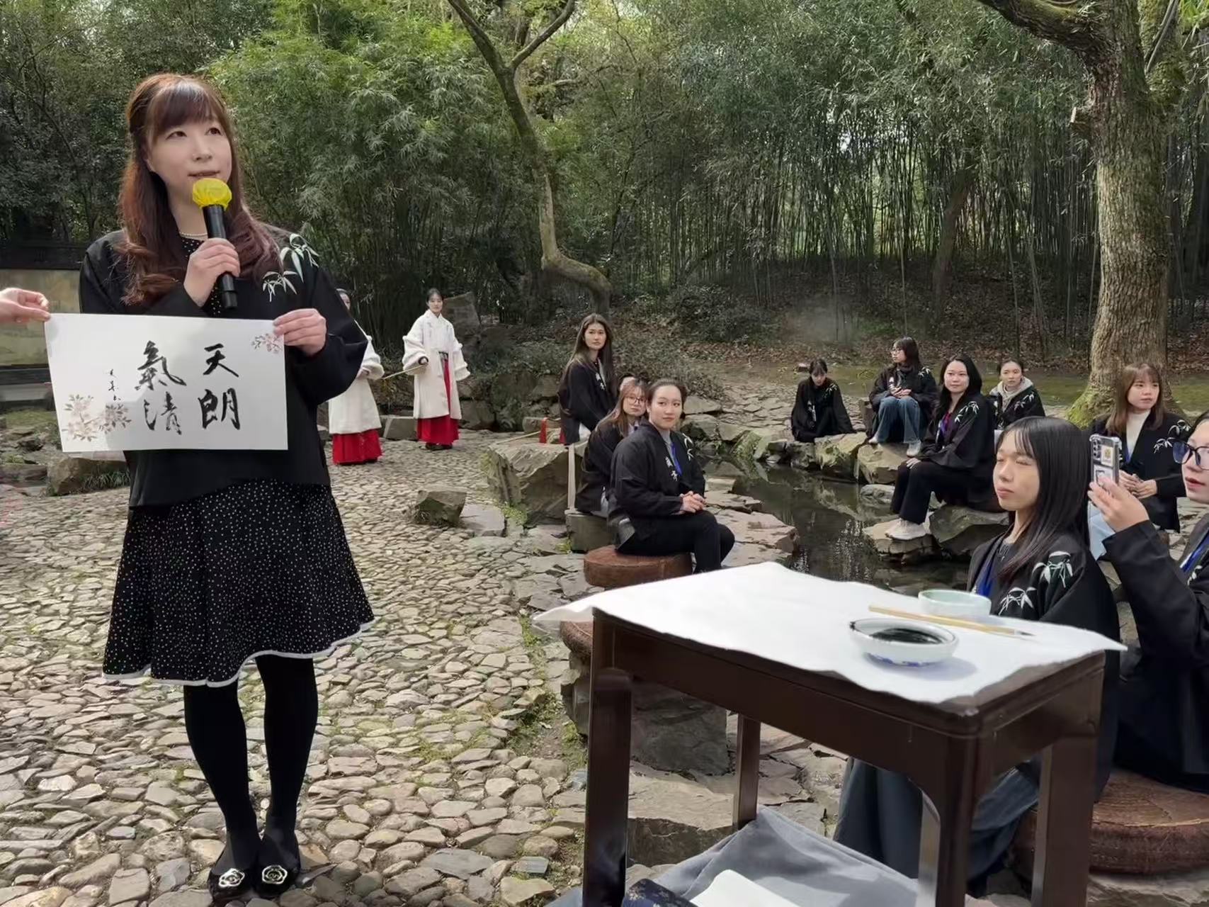 昨年、NHK大河『光る君へ』で取り上げられて日本でも話題になった「曲水の宴」こと「流觴曲水」(りゅうしょうきょくすい)を、書の聖地・蘭亭で体験。目の前でさかずきが止まったら、詩作する代わりに書や歌を披露しました。