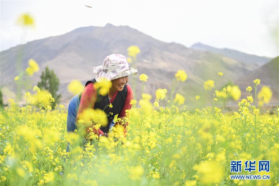 7月2日,拉萨市堆龙德庆区朗巴乡村民玉珍在打理油菜花田。 近日,西藏各地的油菜花盛开,呈现出生机勃勃的夏日美景。 新华社记者 晋美多吉 摄