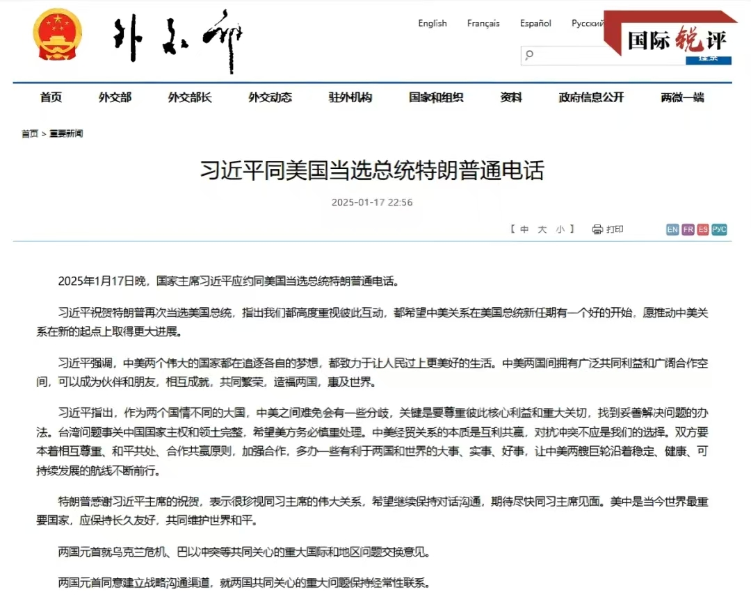 これは重大な時期に行われた重要な電話会談であり、世界は中米関係が新たな出発点を迎えたことに大いに注目している。ブラジル誌フォーラム(電子版)は、この電話会談について「二つの超大国間の生産的で平和的な共存の重要性を際立たせた」と論じた。多くの海外メディアは、双方が相互対話を重視していることについて「中米は小異を残して大同を求めることはできない」との世界の懸念を払拭するのに役立つとの認識を示した。