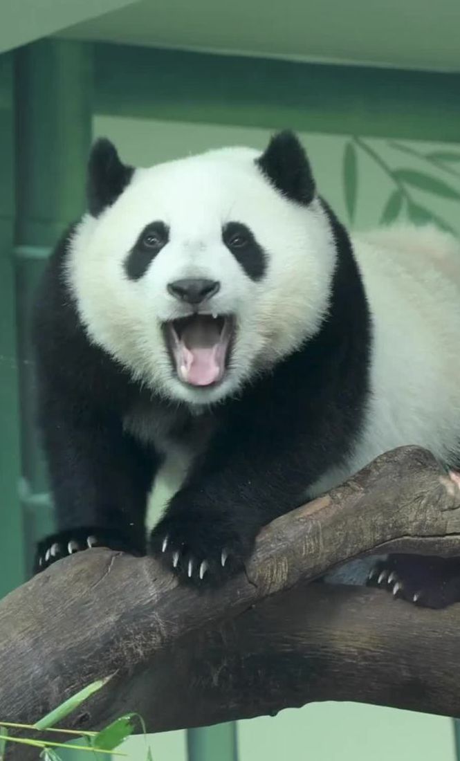 大あくび + 伸び〜のコンボ! #妹珠(メイジュー)があざと可愛い! ただ、あくびをして、ぐ〜っと体を伸ばしただけなのに可愛さ爆発。もしかして、わかってやってる? お願い!もふもふさせて〜🥹 #中国広州長隆野生動物世界 #KANKANパンダアルバム🐼