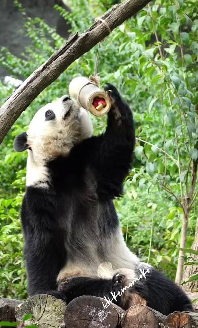 2月15日、竹筒のフルーツを狙う桃浜。 おっとっと!取りそこねてフルーツ全部ぽろぽろ…😆