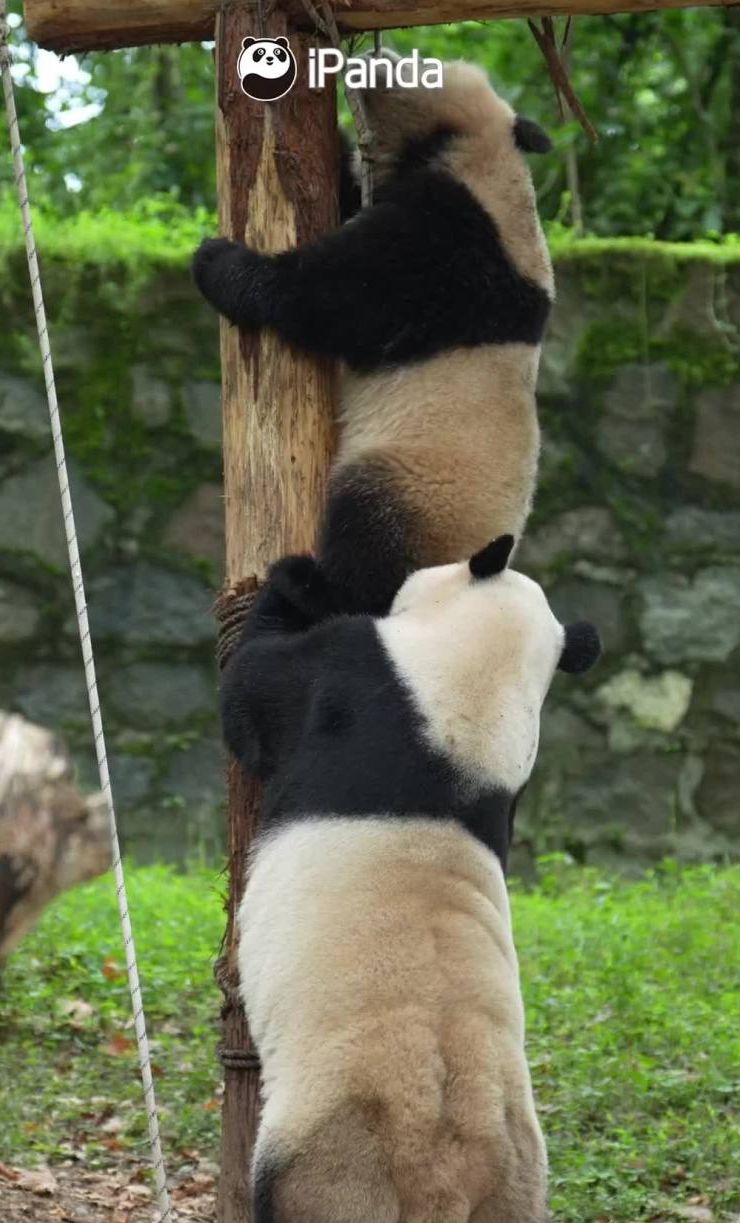 ジャングルジムに登った我が子をハラハラしながら見守る蕊蕊。 降りる時にはお尻をそっと手でサポート!なんて優しいんだろう😍 #中国ジャイアントパンダ保護研究センター都江堰基地 #KANKANパンダアルバム🐼