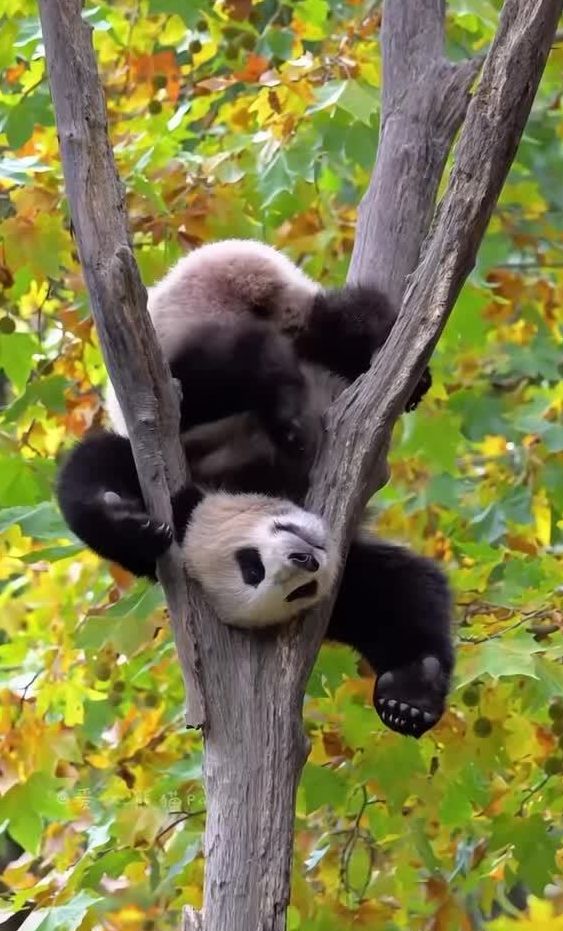 中国南西部・四川省成都市の臥龍パンダ研究センターに暮らす飛虹(フェイホン)ちゃん。木の上で、なんとも複雑なポーズを披露!素晴らしいバランス感覚です。